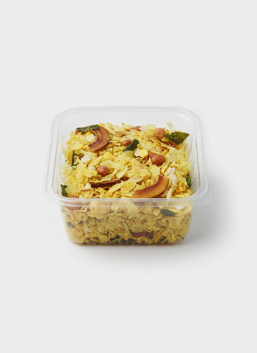 Rice flakes, Peanuts, Dry coconut, Green chilli, Powdered Sugar, Curry leaves, Dry mango powder, Salt, Roasted Chana dal, Refined oil, Mustard Seeds, Asafoetida, Turmeric powder, Kaju